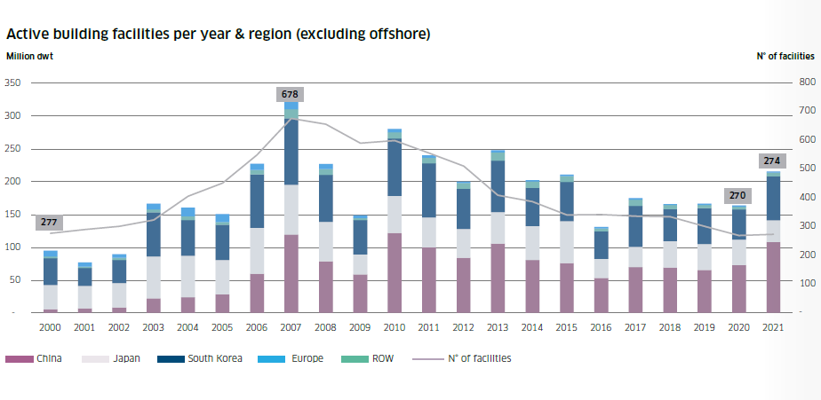 目前,全球活躍船廠(年內接獲新訂單和/或交付新船的船廠)數量為274家,比2020年增加了4家,但僅為2007年最高約700家的40%左右。截止2021年底,全球手持訂單量從2020年底的1.8億載重噸(2003年以來最低數字)增至2.23億載重噸。