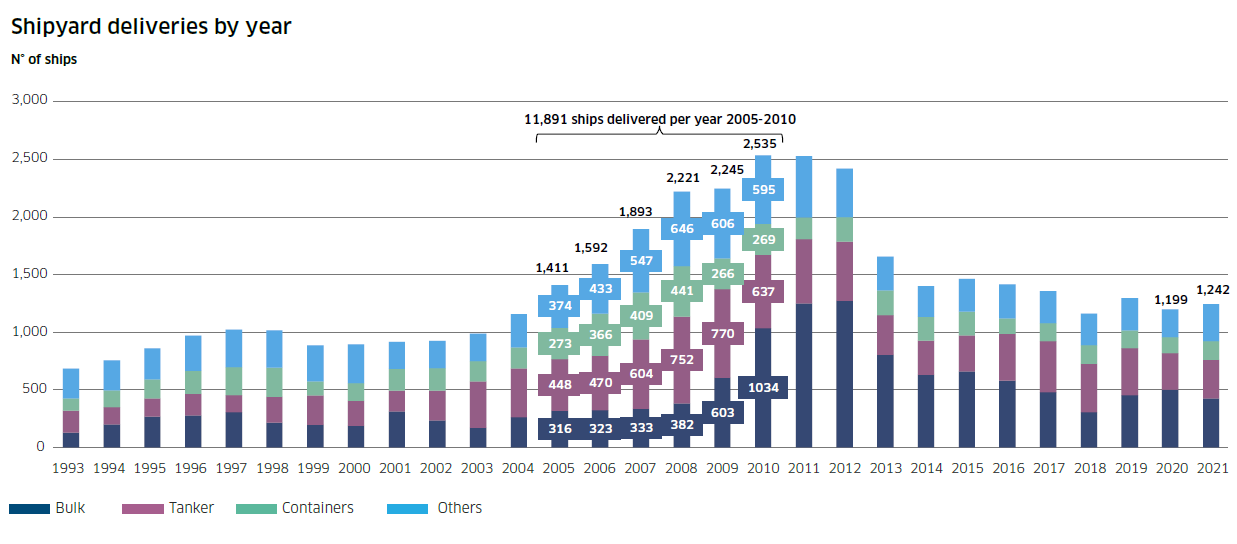 首先,全球造船廠數量已經從2007年的約700家將至目前約300家,在此過程中全球造船產能收縮,目前全球每年能夠建造和交付約1200-1300艘船,遠低于2005-2010年間平均約2000艘的產能水平。