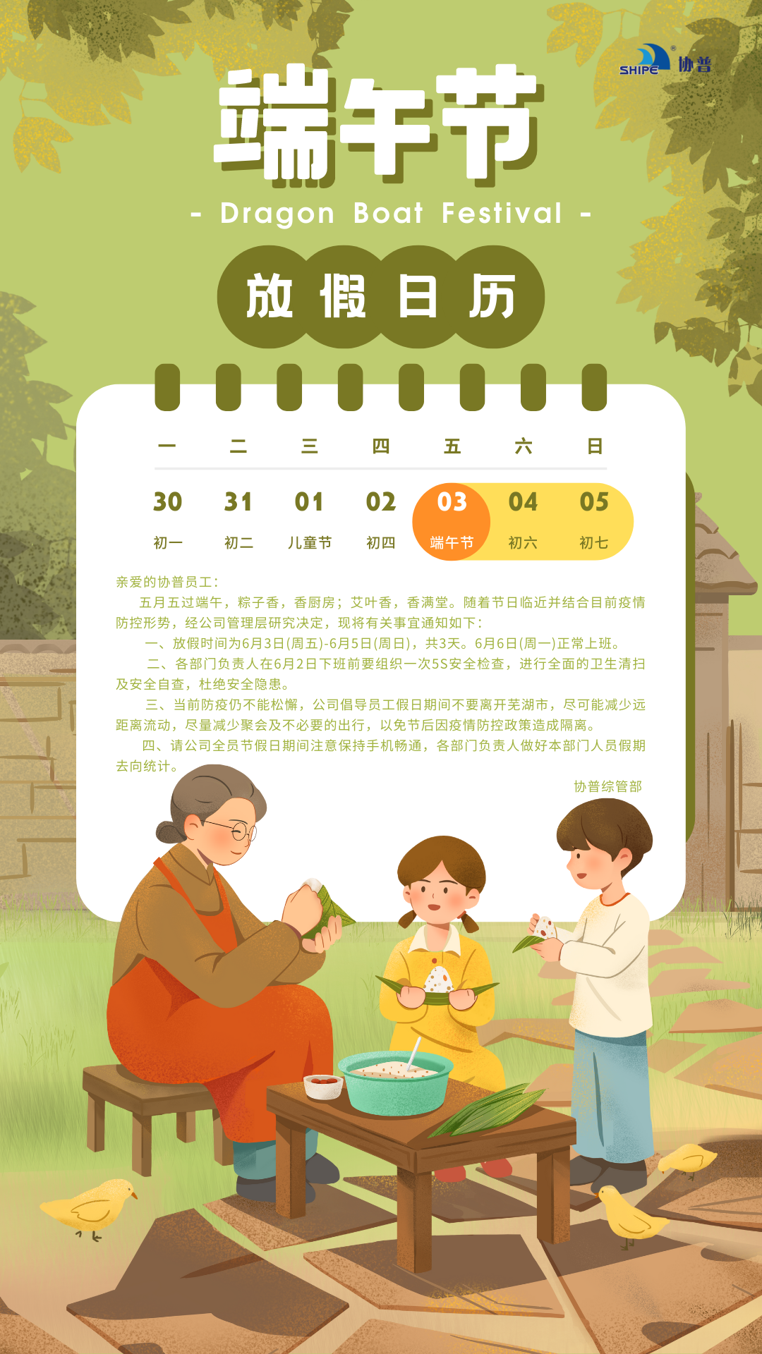 值此端午佳節(jié)來(lái)臨之際,協(xié)普全體員工將于6月3日至6月5日放假三天。