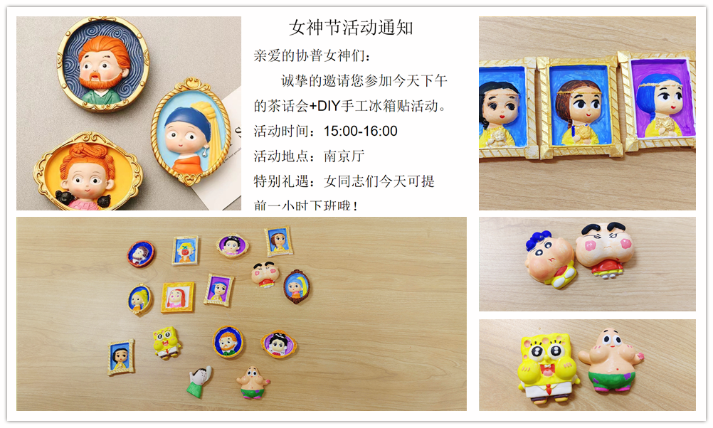 2023年3月8日,值此婦女節(jié)到來之際,協(xié)普不僅為在廠的各位女士準(zhǔn)備了暖心的生活禮品,還將大家聚在一起舉辦了輕松愉快的手繪活動?,F(xiàn)場氣氛歡快,大家悠閑地完成了各自的手繪冰箱貼,活動結(jié)束后全體女同志提前下班,開心地結(jié)束了一天的工作。